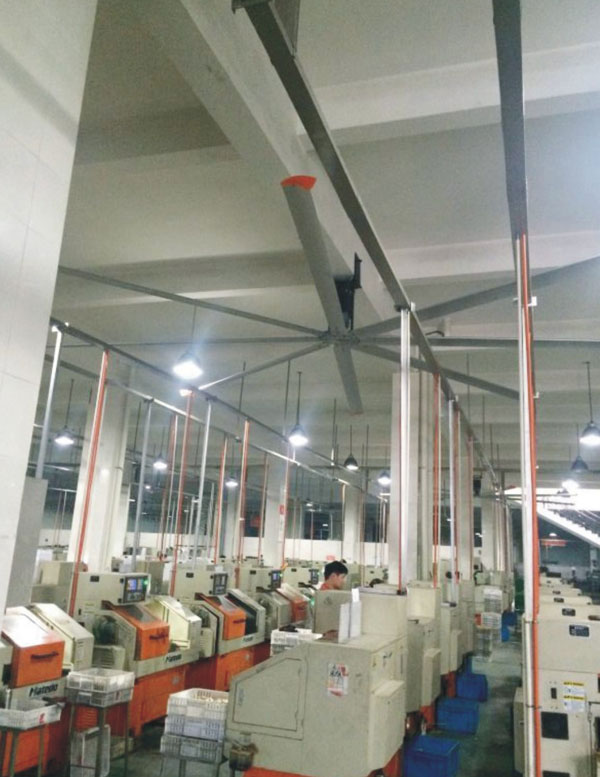 我公司生產的大型工業吊扇直接懸掛在廠房屋梁下,風力柔和,能加快車間空氣流通,有效降低車間內溫度,改善車間空氣環境質量,有利于員工的身體健康。